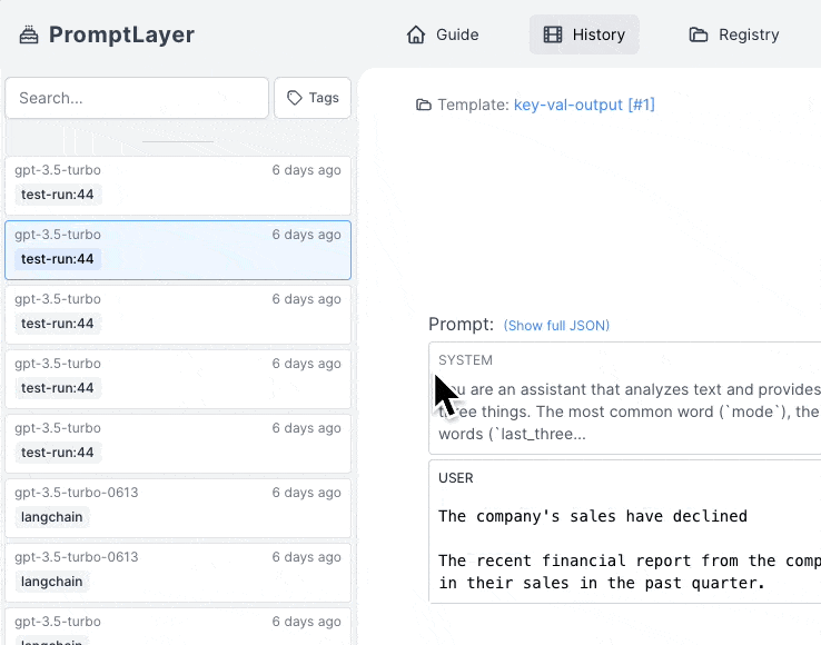 To start your search, enter the keywords you want to find into the search bar and click on the “Search” button. You can use freeform search to find any text within the PromptLayer.
